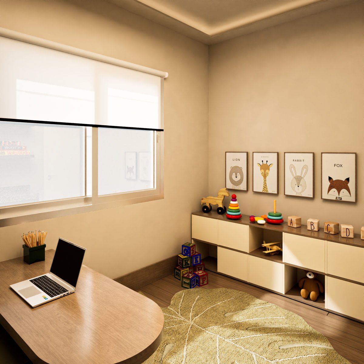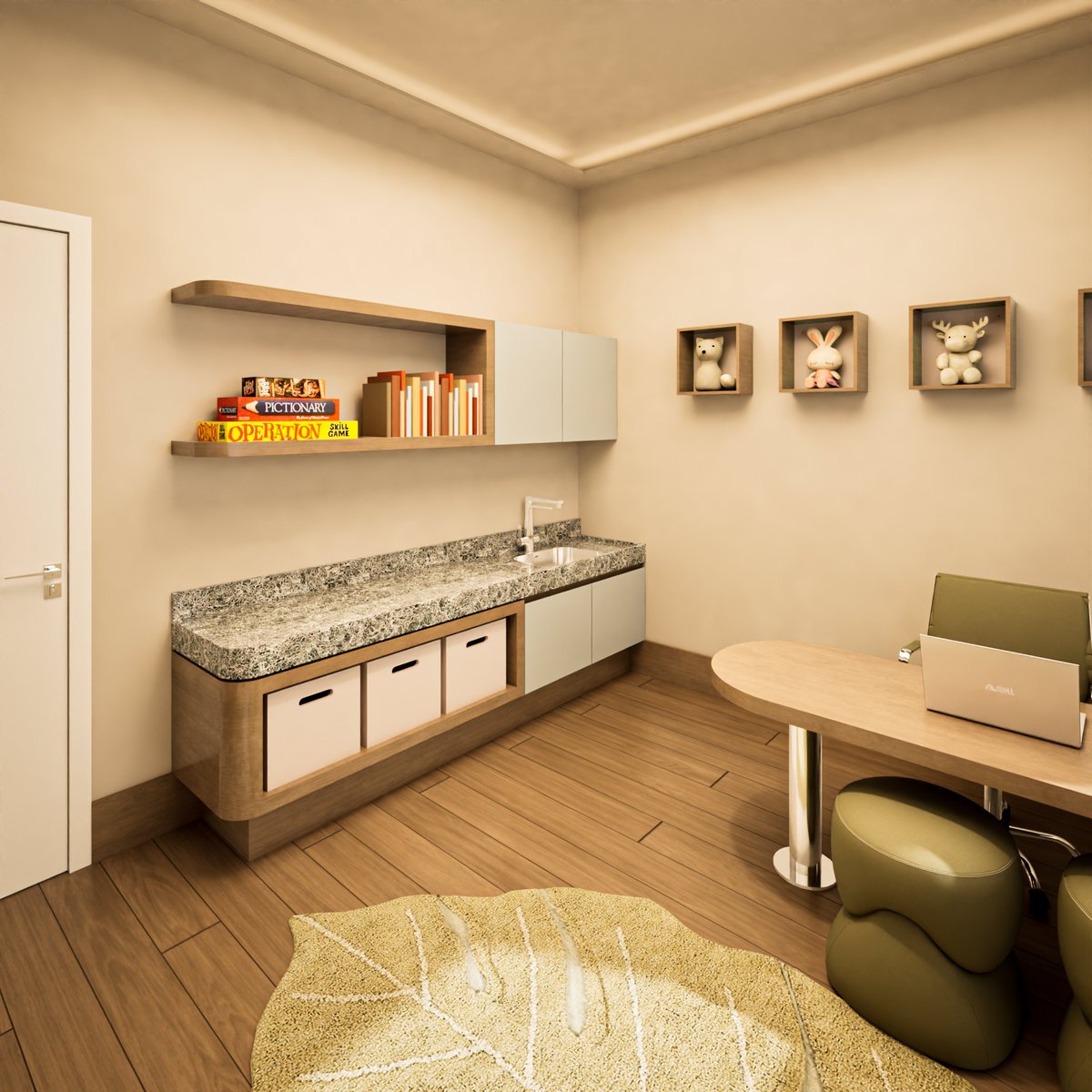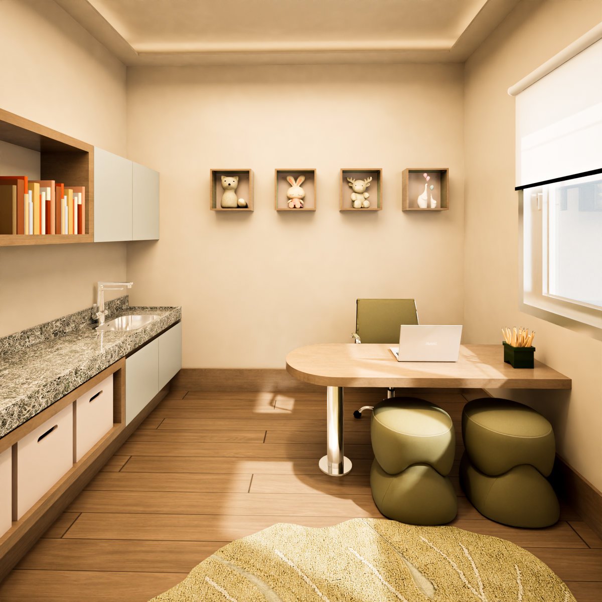 Esta clínica infantil é o equilíbrio perfeito entre espaço de trabalho e um cantinho super inspirador para brincar e aprender. Adoramos a paleta de cores neutras e suaves (bege, off-white e madeira clara), que cria uma atmosfera de calma e aconchego.