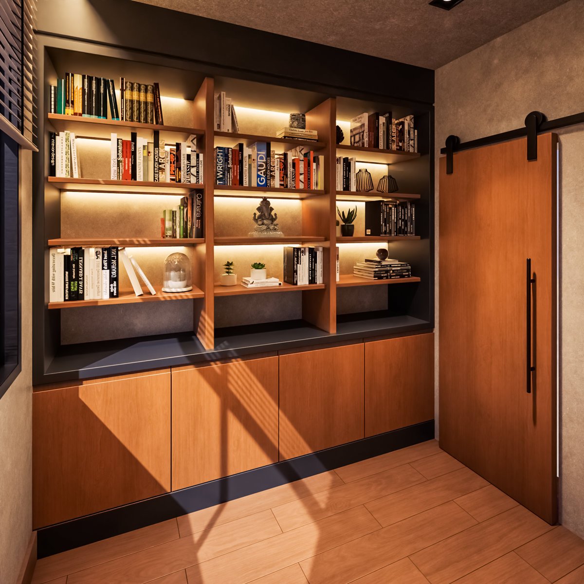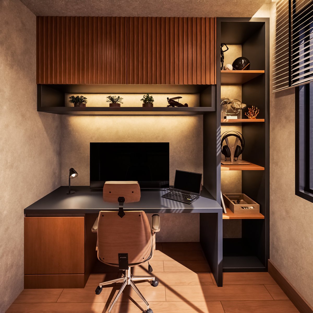 O projeto do pequeno home office foi focado na máxima otimização do espaço através de marcenaria planejada e verticalizada, garantindo funcionalidade em uma área compacta. O design buscou equilibrar seriedade e descontração, utilizando uma base neutra e profissional complementada por toques de cor em acessórios e elementos decorativos, resultando em um ambiente de trabalho produtivo, organizado e que reflete a personalidade do usuário.