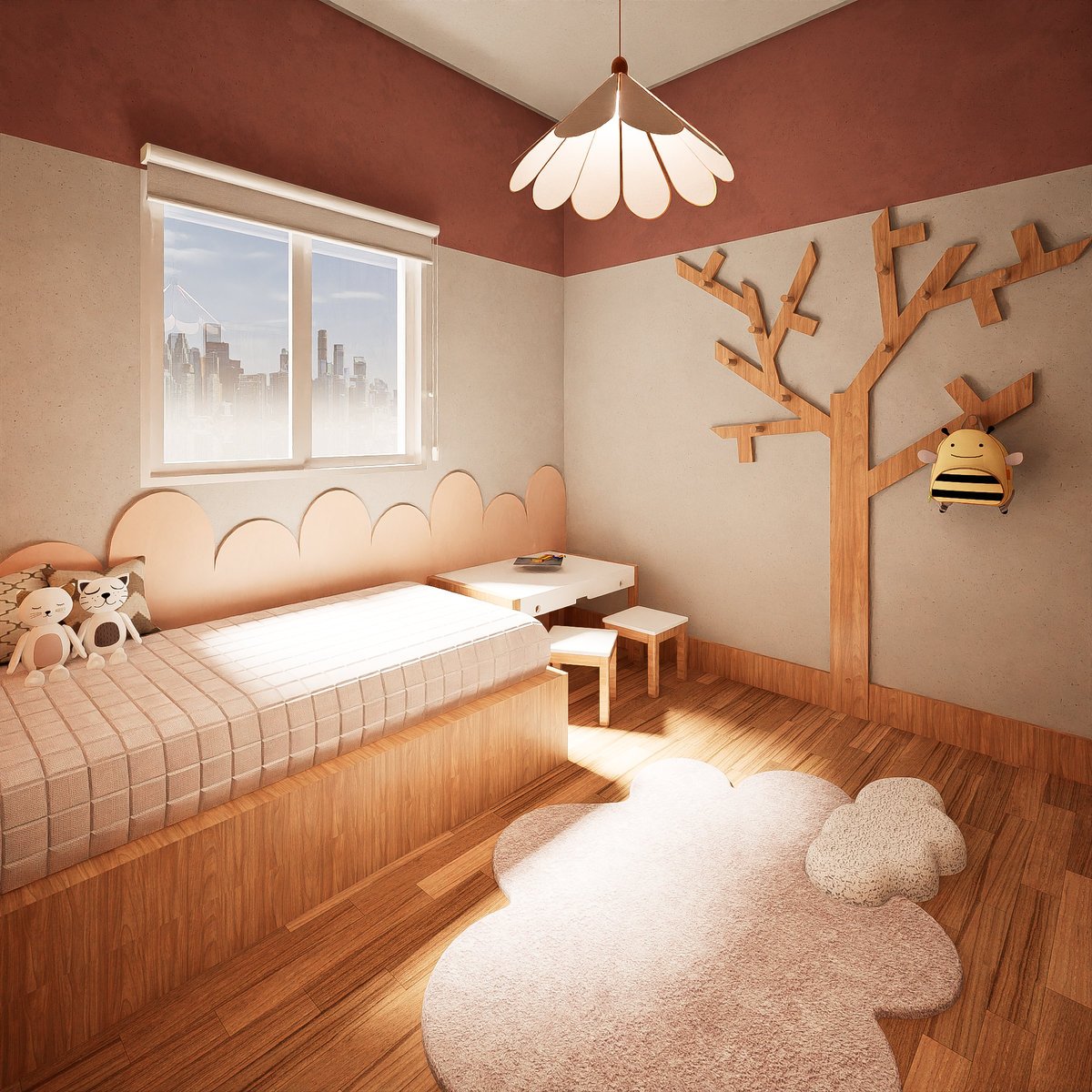 O projeto para o quarto da menina foi focado em criar um ambiente aconchegante e sereno através da utilização estratégica de cores claras e neutras. A paleta principal inclui tons de off-white, bege, rosa claro e cinza suave, que, combinados, ampliam visualmente o espaço e transmitem calma. O conforto é aprimorado com o uso de texturas macias em tapetes, cortinas e roupas de cama. A marcenaria foi pensada para ser funcional, oferecendo armazenamento eficiente sem poluir o visual, enquanto a iluminação indireta e quente contribui para uma atmosfera acolhedora e delicada, ideal para o descanso e a brincadeira.