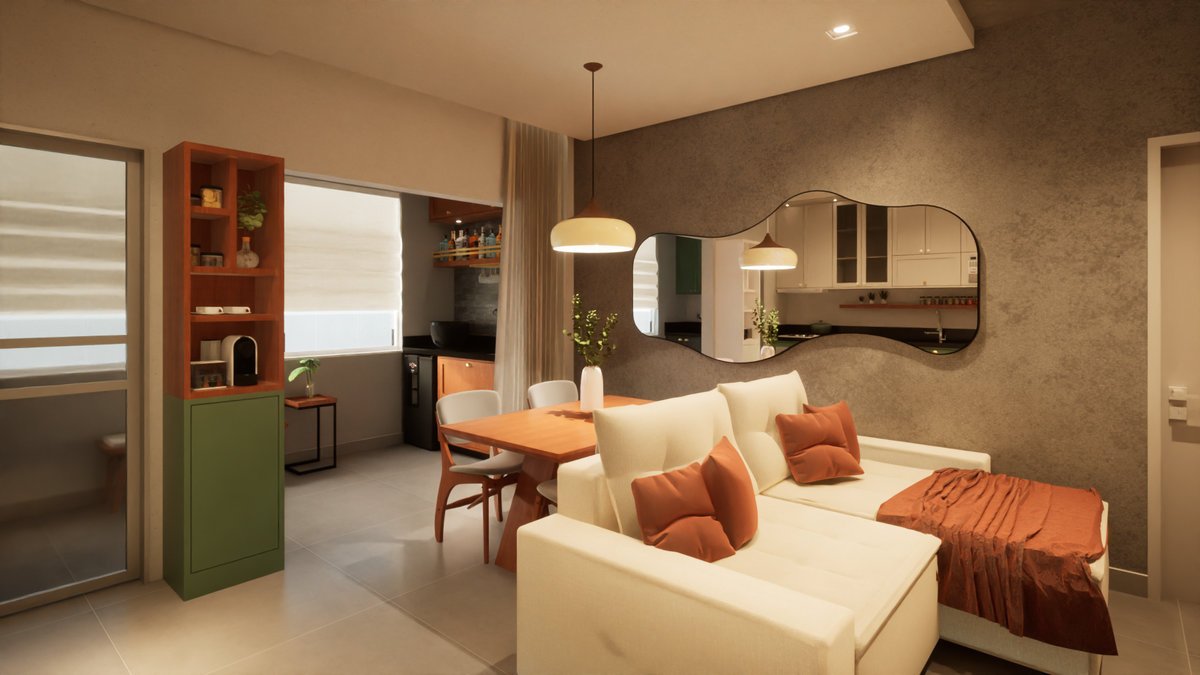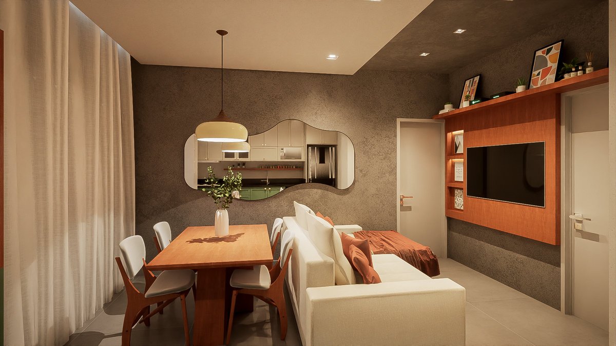O projeto desta sala de estar buscou entregar uma estética sofisticada e requintada, com o objetivo principal de otimizar o espaço dos móveis para garantir um fluxo eficiente e a máxima funcionalidade.